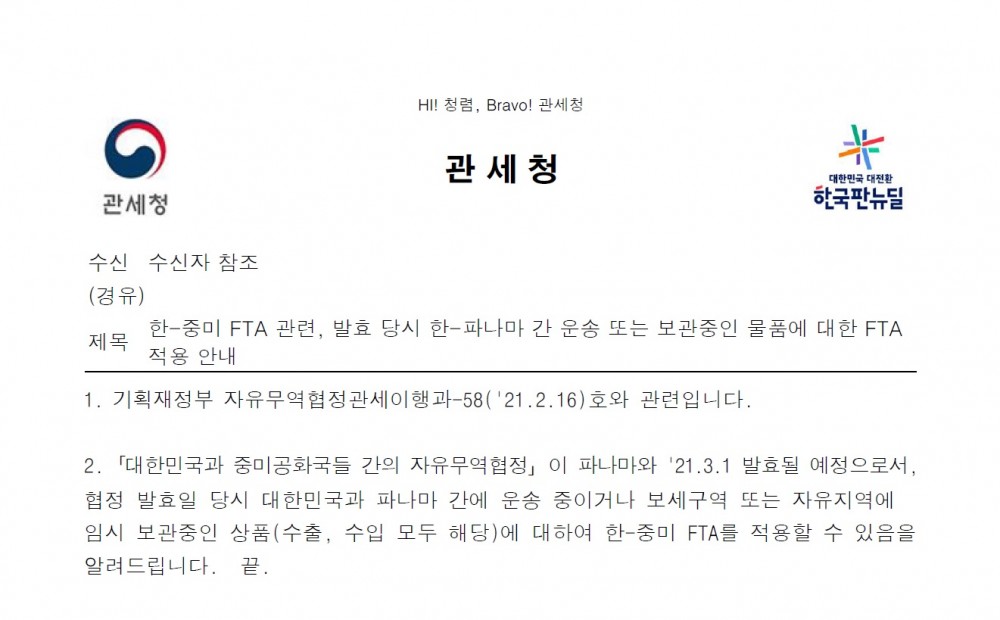 프린트 FTA | 한-중미 FTA 관련, 발효 당시 한-파나마 간 운송 또는 보관중인 물품에 대한 FTA 적용 안내 작성자 인천공항지부 작성일21-02-19 10:37 조회2,721회 ※ 문의 : 관세청 자유무역협정기획담당관실 T. 042-481-3206 <출처 : 본회 공지사항> 이전글 다음글 목록